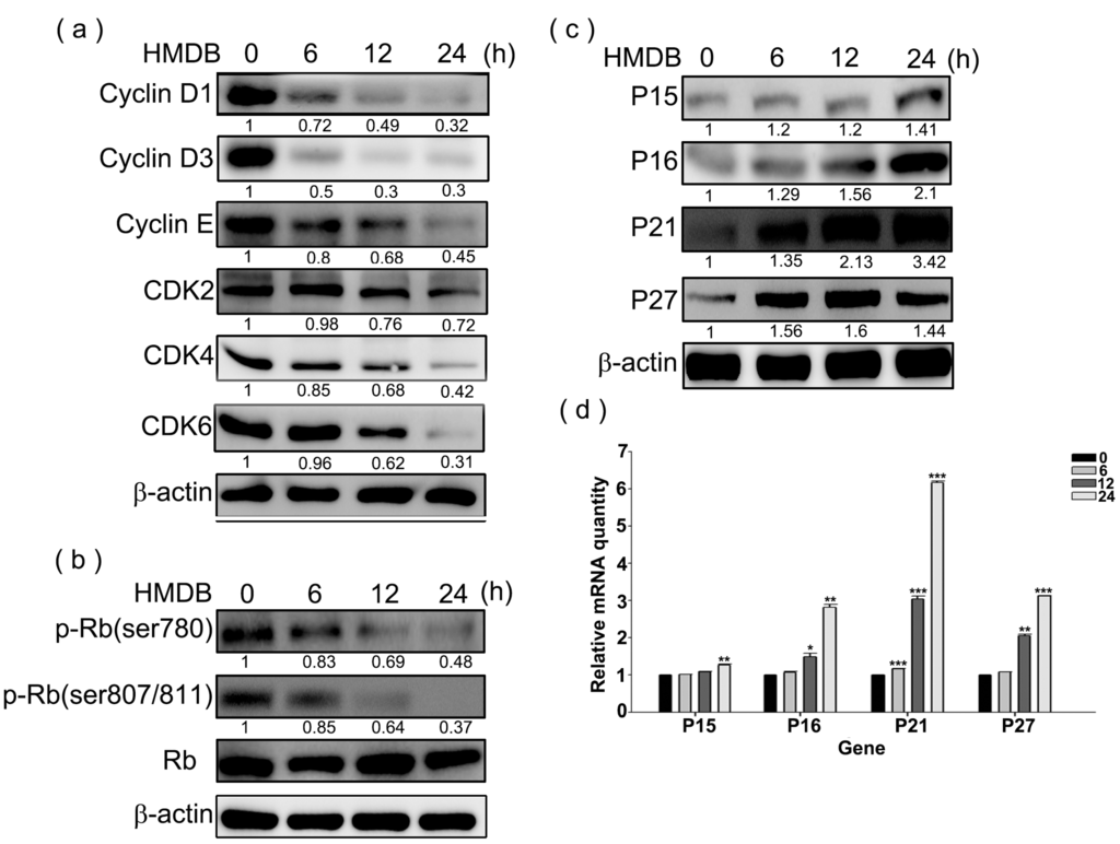 Effects of HMDB on the expression of G1-related cyclins, cyclin-dependent kinases (CDKs), and CDK inhibitors (CKIs). (a) Relative protein expression levels of cyclin D1/D3/E, and CDK4/6/2 expressed in the G1 phase; (b) the total and phosphorylated forms of retinoblastoma (Rb) with specific antibodies for each; and (c) the change in the protein expression levels of CKIs (p15, p16, p21, and p27). HeLa cells were exposed to 40 μM HMDB for the indicated times. Then, cellular extracts were harvested and the protein levels were visualized by Western blotting using antibodies against G1 cell cycle regulators as indicated. The β-actin acts as an internal control for evaluating protein loading; and (d) the changes in mRNA expression levels of CKIs, including p15, p16, p21, and p27, by HMDB. The relative amounts of target mRNA, collected from HMDB-treated HeLa cells, were determined by qRT-PCR for the indicated time. All of the results that come from independent experiments three times are expressed as mean ± SE. The relative amounts of protein levels on the Western blots were quantitated with a computerized densitometer (ImageQuant LAS4000 Digital System, GE Healthcare, Uppsala, Sweden) compared to the control group. Values were statistically significant for * p < 0.05, ** p < 0.01, *** p < 0.001 as compared with the control group (without HMDB treatment).