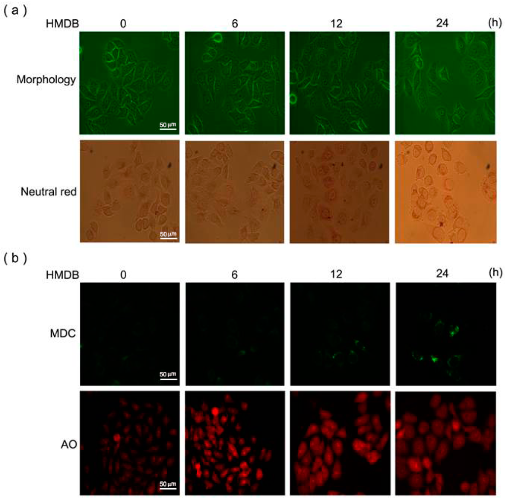 HeLa cells were treated with 40 μM HMDB for 0, 6, 12 and 24 h. After washing with fresh culture medium, the cells were stained with the autofluorescent dye containing 0.05 mM monodansylcadaverine (MDC) (Sigma-Aldrich, St. Louis, MO, USA) in PBS at 37 °C for 1 h, and then fixed with cold 4% paraformaldehyde for 15 min. For acridine orange staining, the cells were stained with 1 μg/mL acridine orange (AO) (Sigma-Aldrich, St. Louis, MO, USA) at 37 °C for 15 min, and then fixed with cold 4% paraformaldehyde for 15 min. The stained cells were washed with PBS three times and visualized under a contrast microscope.