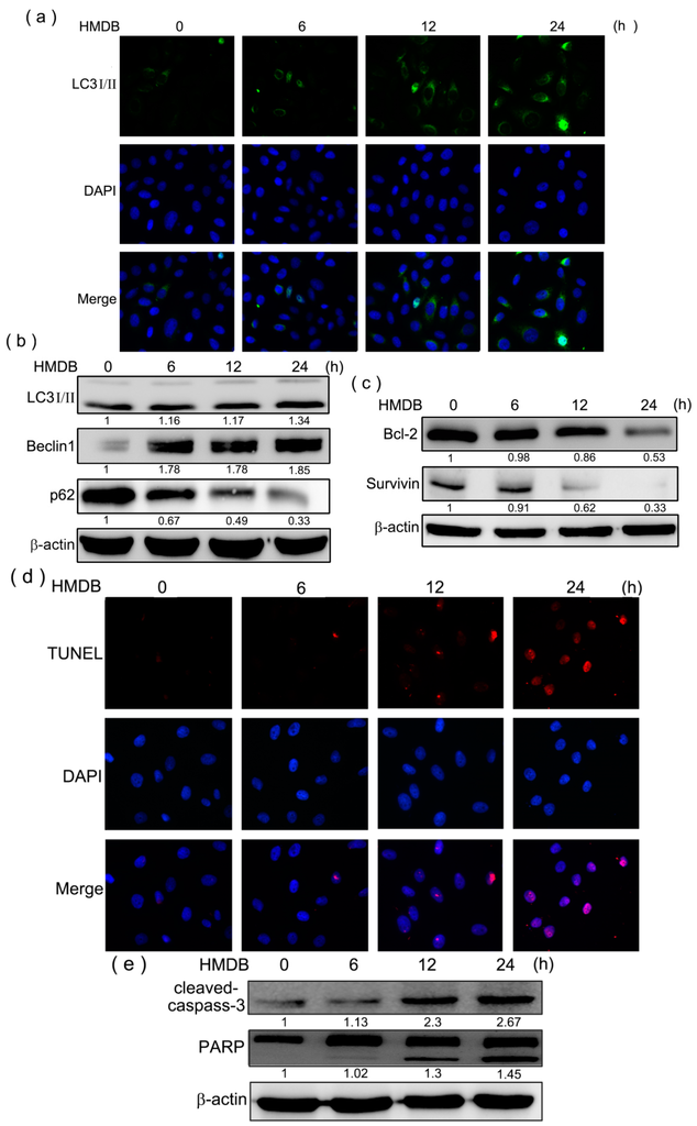 HMDB induced autophagy and apoptosis in HeLa cells. (a) HeLa cells were treated with 40 μM HMDB for the indicated times, fixed and incubated with rabbit anti-LC3-II primary antibody. After incubation with Alexa Fluor 488 phalloidin (green) for conjugated anti-rabbit secondary antibodies, immune-labeled cells were monitored by microscopy; (b) HeLa cells were treated with 40 μM HMDB and then the protein expression levels of LC3-II, Beclin-1, and p62 were determined by Western blotting for the indicated times; (c) the cells were treated with 40 μM HMDB for different times. Cells were harvested and lysed for the detection of the indicated protein expression by Western blotting; (d) the cells were treated with 40 μM HMDB for the indicated times, and then the apoptotic cells were examined by TUNEL assay; and (e) the apoptosis-related proteins, cleaved caspase-3, and poly (ADP-ribose) polymerase (PARP), were assessed using Western blotting. The densities of the band on the Western blots from three independent experiments were calculated using a computerized densitometer (ImageQuant LAS4000 Digital System, GE Healthcare, Uppsala, Sweden). Nuclei were stained with 4′,6-diamidino-2-phenylindole (DAPI).