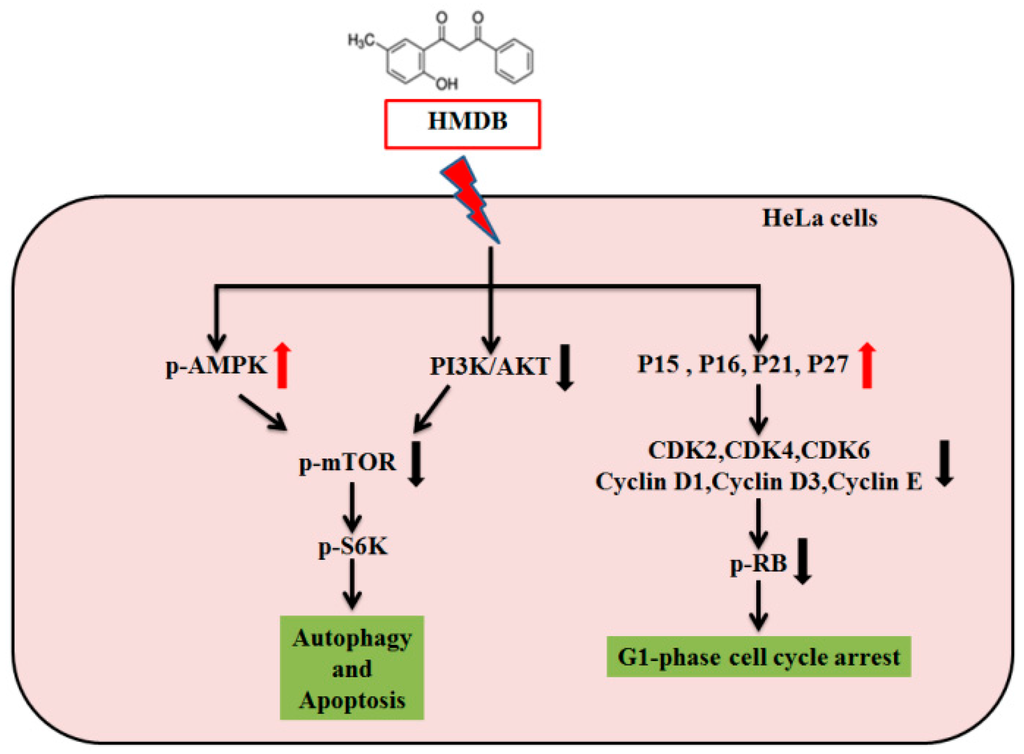 The proposed signal pathway activated by HMDB in HeLa cervical cancer cells. Red arrows represent increased protein expression by HMDB, while black arrows indicate a decrease.