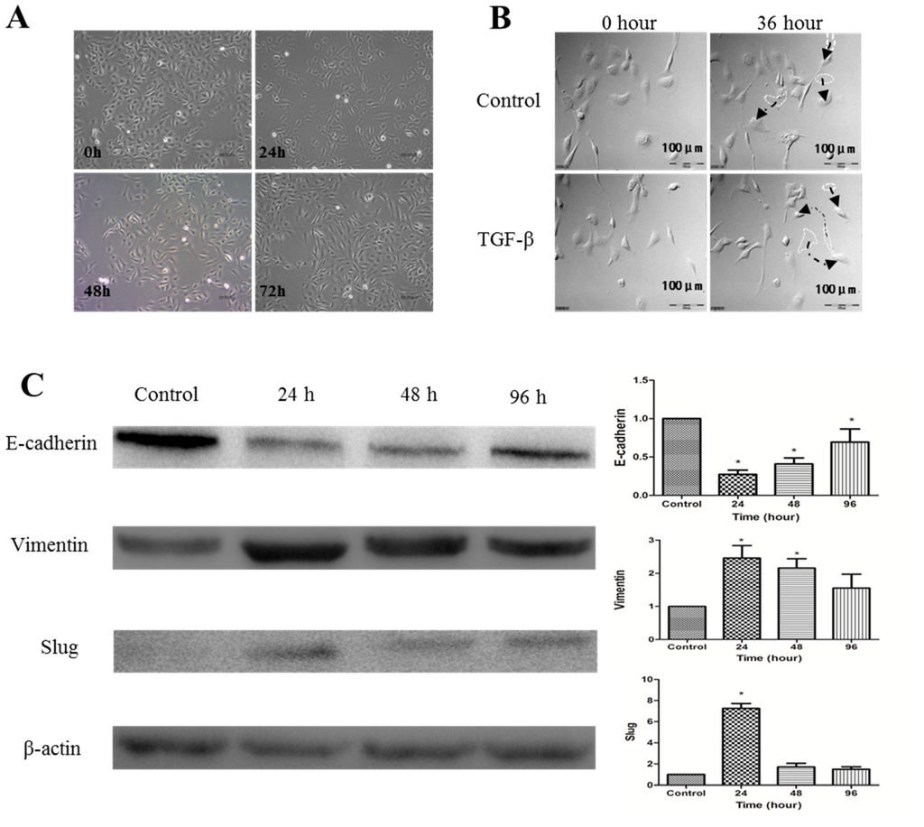 Transforming growth factor-β1 (TGF-β1) induces EMT of SKOV-3 cells. (A) SKOV-3 cells were exposed to 10 ng/mL of TGF-β1. Compared to the group of control, TGF-β1-treated SKOV-3 cells lost their cobblestone shape and adopted a fibroblast-like, spindle-shaped morphology. Morphology photographs were taken at 24, 48, and 72 h (magnification of 400×); (B) analyses with a Live Cell Imaging System showed that the movement distance increased further after SKOV-3 cells were treated with TGF-β1 for 36 h than control cells (Arrows refer to the movement track of SKOV-3 cells); (C) Left: Western blot analysis of the indicated proteins in SKOV-3 cells. β-actin served as a loading control; Right: the level of the indicated protein was quantified with gray value. The data represent the Mean ± SD. * p < 0.05 versus control.