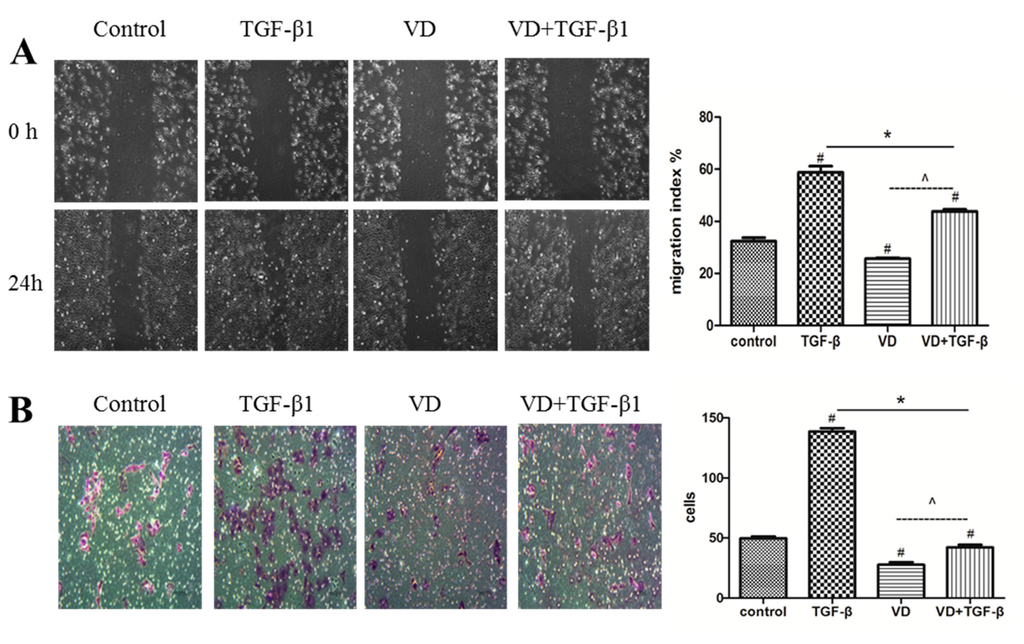 1α,25(OH)2D3 inhibited the migration and invasion of SKOV-3 cells during TGF-β1-induced EMT. (A) Left: representative pictures of the wound area obtained 24 h after scratching. 100× magnification; Right: migration index (%) = [(the initialized width of the scratch) − (the final width of the scratch)]/(the initialized width of the scratch); (B) Left: invasion assay was carried out using the 24-well Becton Dickinson (BD) Biocoat Matrigel Invasion Chambers(magnification of 400×); Right: the cells on the bottom of inserts were counted under microscope. # p < 0.05 versus negative control, * p < 0.05 versus TGF-β1, and ^ p < 0.05, 1α,25(OH)2D3 (VD) + TGF-β group versus VD group.