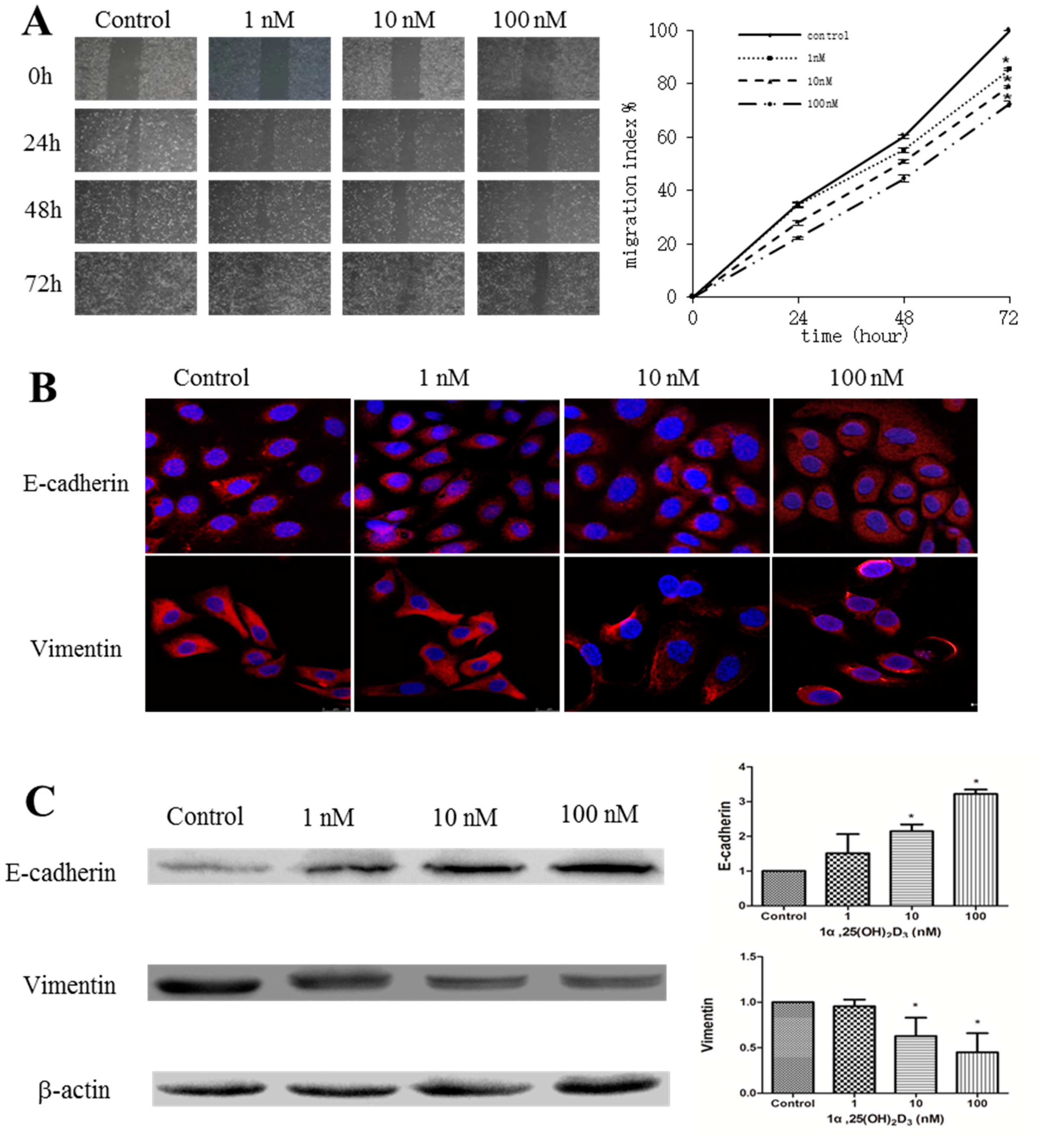 Hou Y-F, Gao S-H, Wang P, Zhang H-M, Liu L-Z, Ye M-X, Zhou G-M, Zhang Z-L, Li B-Y. 1α,25(OH)2D3 Suppresses the Migration of Ovarian Cancer SKOV-3 Cells through the Inhibition of Epithelial–Mesenchymal Transition. International Journal of Molecular Sciences. 2016; 17(8):1285. https://doi.org/10.3390/ijms17081285