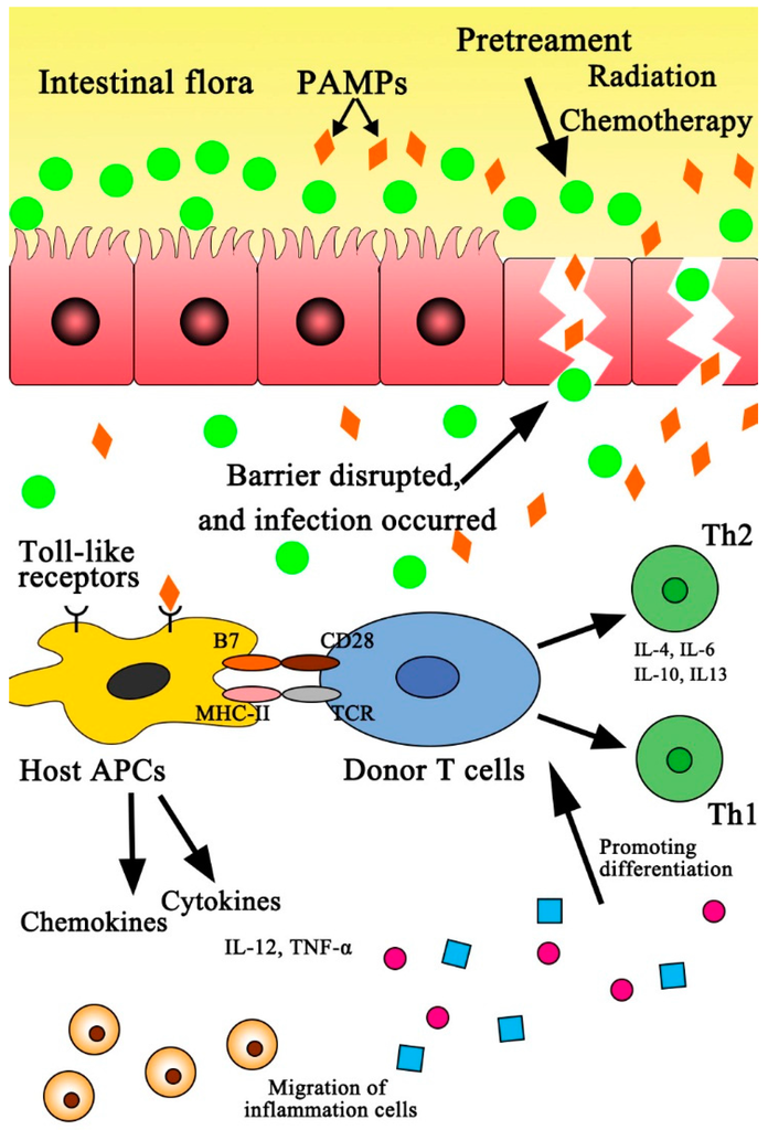 Schematic graph of GVHD initiated by intestinal flora. Intestinal flora enter the systemic circulation through damaged intestinal mucosa, and then interact with Toll-like receptors (TLRs), leading to the upregulation of major histocompatibility complex class II (MHCII) and costimulatory molecules B7 on host APCs. The upregulation of MHCII and costimulatory molecules B7 present the first and second activation signals, respectively, to donor T cells for the production of cytokines (including IL-1, IL-6, IL-12, IL-21, IL-22, IL-23, TNF-α and IFN-γ). The cytokines then induce the differentiation of a sub-population of donor T cells (Th1/Th2). Subsequently, the activated donor-derived T cells attack target tissues or organs (including intestine, liver and skin) by direct cytotoxicity, and eventually leading to GVHD. PAMPs = pathogen-associated molecular patterns; APCs = antigen-presenting cells; Th1 = helper T cell 1; Th2 = helper T cell 2.
