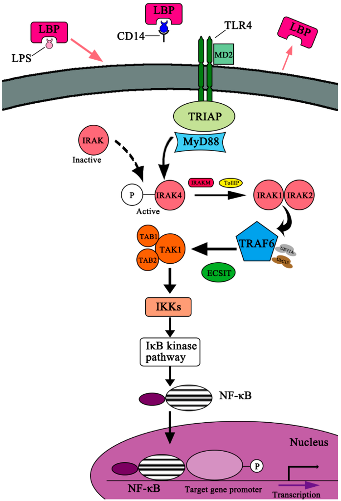 Diagram of LPS-induced TLR4 signaling. LPS, the breakdown bacterial component, binds to LBP, and then is released from the LPS-LBP complex, and is presented to CD14 and TLR4 on APCs, leading to the activation of TLR4. With the assistance of MD-2, an important component of activated TLR4, termed Toll/IL-1 receptor (TIR) homologous domain, binds to the C-terminus of cytoplasmic adaptor proteins MyD88, while the death domain (DD) at the N-terminus of MyD88 interacts with intercellular enzyme IL-1 receptor-associated kinase (IRAK), eventually resulting in the phosphorylation of IRAK and the activation of TNF-α receptor-associated factor 6 (TRAF-6). The phosphorylated IRAK binds to the activated TRAF, and the complex activates TGF-β-activated Kinase-1(TAK1), triggering the activation of inhibitor of κ polypeptide gene enhancer in B-cells (IκB) kinase, eventually activating the NF-κB signaling pathway. The NF-κB signaling pathway upregulates the expression levels of the target gene. The activated NF-κB signaling initiates the expression of target genes, leading to the damage of target organs. TLR4 = Toll-like Receptor-4; LBP = lipopolysaccharide-binding Protein; TIR = Toll-Interleukin-1-Receptor; TIRAP = Toll-Interleukin-1-Receptor Domain-containing Adapter Protein; MyD88 = Myeloid Differentiation Primary Response Protein-88; IRAK = Interleukin-1 Receptor-associated Kinase; IRAKM = Interleukin-1 Receptor-associated Kinase-M; TollIP = Toll-Interacting Protein; TRAF6 = Tumor Necrosis Factor Receptor-associated Factor-6; UbC13 = Ubiquitin-conjugating Enzyme-13; UEV1A = Ubiquitin-conjugating Enzyme E2-Variant-1; ECSIT = Evolutionarily Conserved Signaling Intermediate in Toll Pathways; TAK1 = TGF-β-activated Kinase-1; TAB1 = TAK1-binding Protein-1; TAB2 = TAK1-binding Protein-2; IKKs = Inhibitor of κ Light Polypeptide Gene Enhancer in B-Cells Kinase.