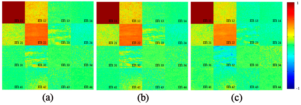 2D images of Mueller matrices of silk sample washed by color stain net: (a) before washing; (b) after the third washing; (c) after the sixth washing. The color bar is from −1 to 1 for the m11, m22, m33, and m44, and from −0.1 to 0.1 for other elements.