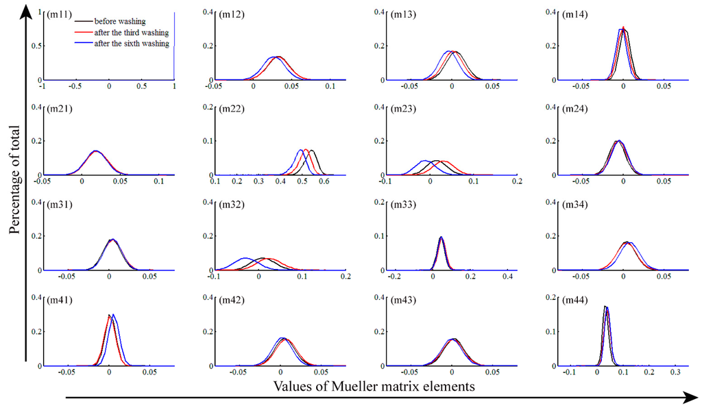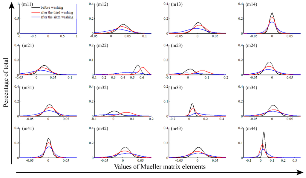 Frequency distribution histograms (FDHs) of Mueller matrix elements of silk sample washed by the color stain net: before washing (black lines), after the third wash (red lines) and the sixth wash (blue lines). The areas under the FDH curves are normalized to 1, and the horizontal axis is divided into 400 parts.