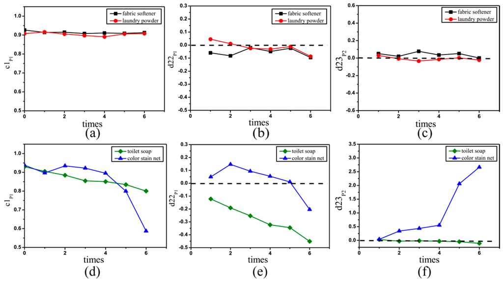 FDH parameters c1p1 (left), d22p1 (middle) and d23p2 (right) of silk samples washed by different detergents. (a–c) are the values of three parameters for the silk samples washed by the group A detergents: fabric softener in black square lines and laundry powder in red dot lines; (d–f) are the values of three parameters for the silk samples washed by the group B detergents: toilet soap in green diamond lines and color stain net in blue triangle lines. The horizontal axis represents the washing times.