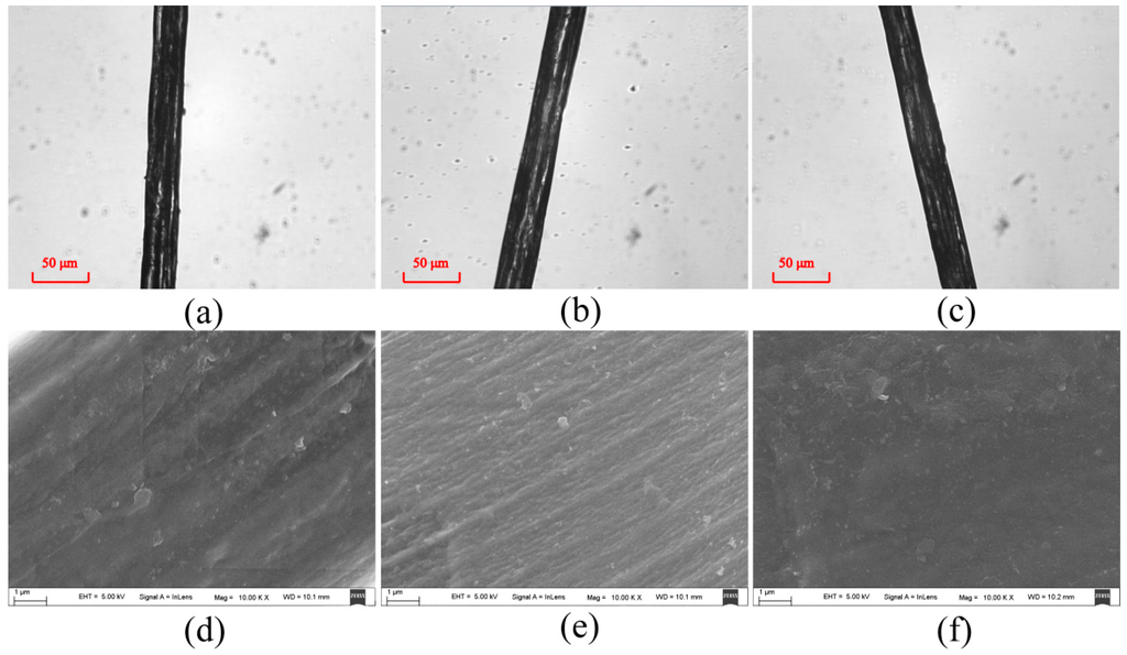 Optical microscopic images of silk samples in group A: (a) before washing; (b) after the sixth washing by fabric softener; (c) after the sixth washing by laundry powder. Scanning electron microscopic images (10,000×) of silk samples in group A: (d) before washing; (e) after the sixth washing by fabric softener; (f) after the sixth washing by laundry powder.
