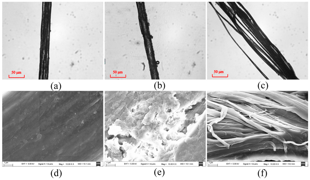 In order to study the relationship between the parameters used in Section 3.3 and the characteristic wavelength-scale microstructural variations of the silk samples, we observed the silk strands, which are consisted of tens of silk fibers, under an optical microscope and a scanning electron microscope. Figure 6 shows the optical and scanning electron microscopic images of the unwashed silk strand (Figure 6a,d) and the strands washed six times by group A detergents: fabric softener (Figure 6b,e) and laundry powder (Figure 6c,f). Figure 7 shows the optical and scanning electron microscopic images of silk strands before washing (Figure 7a,d) and washed six times by group B detergents: toilet soap (Figure 8b,e) and color stain net (Figure 7c,f). From Figure 6 and Figure 7, we can see that the wavelength-scale microstructures of the silk strands almost stay the same in group A, whereas they change prominently in group B. It confirms that the three new parameters based on FDHs can be used to assess the influences of the detergents on the wavelength-scale microstructures of silk samples. Moreover, in our previous discussion, we have found that for the silk samples in group B, the parameters d22p1 and d23p2 represent different change trends. This indicates that the parameters may be not only a kind of indicator to reveal whether the wavelength-scale microstructural changes occurred, but also a tool to characterize what kind of structural changes happened. It can be seen from Figure 7 that the structural changes are not the same for the silk fibers washed by toilet soap and color stain net, which demonstrates the assumption.