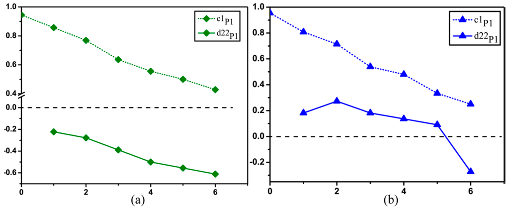 Monte Carlo simulation results of the parameters c1p1 and d22p1 using the SCSM. (a) The x-axis represents different values of sphere/cylinder ratio from (1) 10:70 to (2) 13:67; (3) 15:65; (4) 21:59; (5) 22:58; (6) 27:53 and (7) 28:52; (b) The x-axis represents different values of the diameter and standard deviation of angular distribution of the cylinders from (1) 1.5 µm 15 degree to (2) 1 µm 15 degree; (3) 0.9 µm 19 degree; (4) 0.86 µm 19 degree; (5) 0.76 µm 20 degree; (6) 0.68 µm 21 degree; and (7) 0.68 µm, 22 degree.
