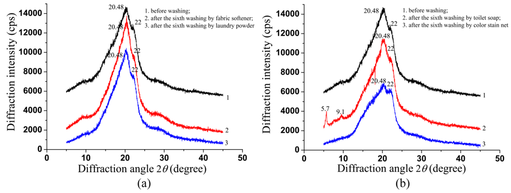 X-ray diffraction curves of silk samples. (a) 1. The silk before washing; 2. The silk after the sixth washing by fabric softener; 3. The silk after the sixth washing by laundry powder; (b) 1. The silk before washing; 2. The silk after the sixth washing by toilet soap; 3. The silk after the sixth washing by color stain net.