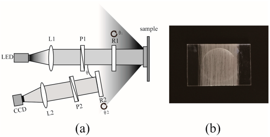 We adopt a typical experimental setup based on the dual rotating retarder configuration for backscattering Mueller matrix measurements [30,31]. As shown in Figure 10a, the polarization states of the incident light from the LED (633 nm, 3 W) are controlled by a linear polarizer (P1, extinction ratio > 1000:1, Daheng Optic, Beijing, China) and quarter-wave plate (R1, Daheng Optic). Then the collimated light of different polarization states illuminates the sample, and the backscattered photons pass through another quarter-wave plate (R2, Daheng Optic) and linear polarizer (P2, extinction ratio > 1000:1, Daheng Optic). Finally the photons are collected by a CCD camera (QImaging 32-0122A, 12 bit, Surrey, BC, Canada). There is an oblique angle (θ = 15°) between the illuminating and detection arms to avoid the surface reflection from the sample.