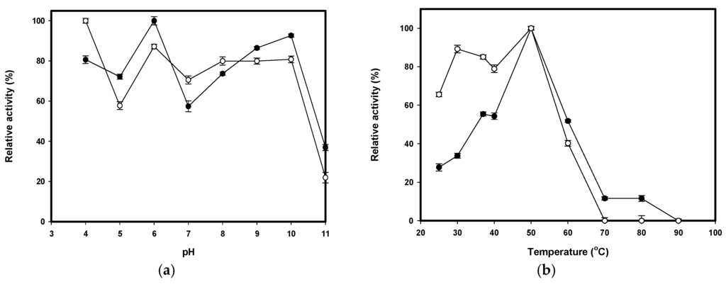 3.6. Effects of pH and Temperature on Enzyme Activity and Stability