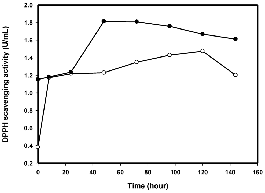 DPPH free radical scavenging activities of TKU038 culture supernatants (●) and CS038 hydrolysate (○) at various cultivation/reaction times.