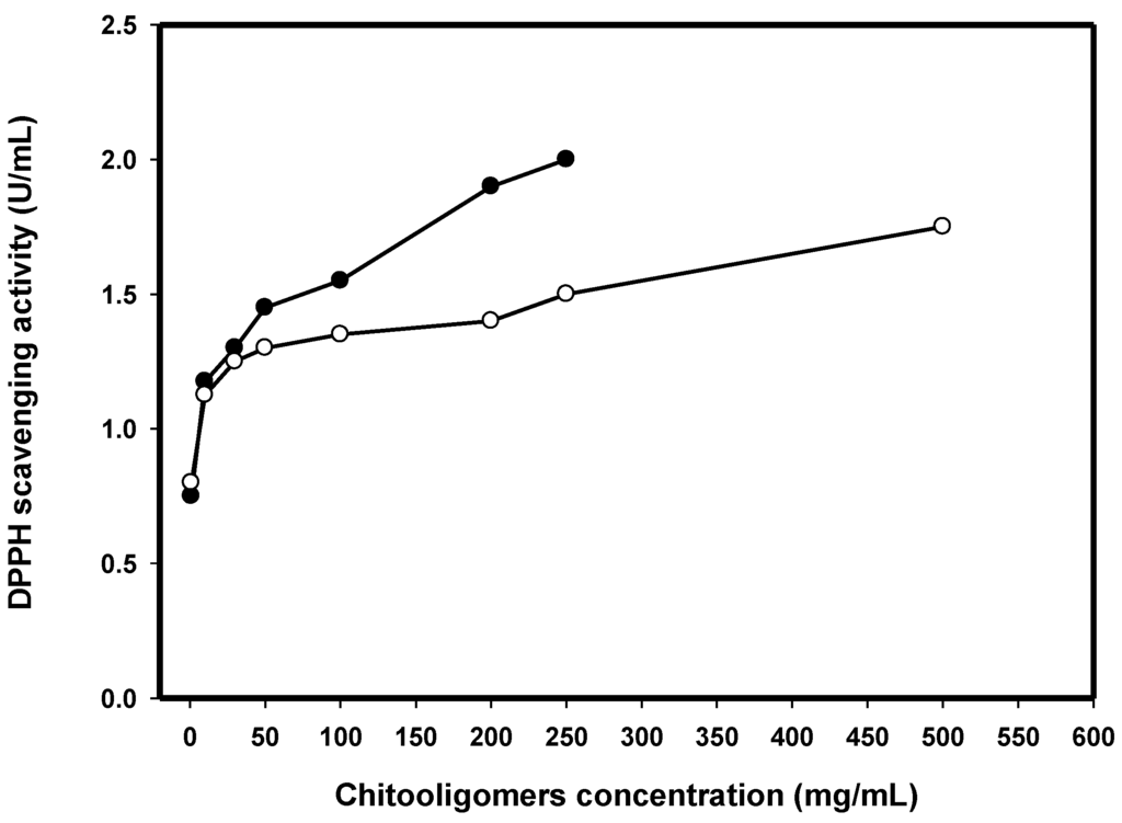DPPH free radical scavenging activities of COSs hydrolyzed from CS038 with two types of degree of polymerization (DP) range (S1, 8 < DP < 16, (●); S2, DP < 8, (○)) at various concentrations.