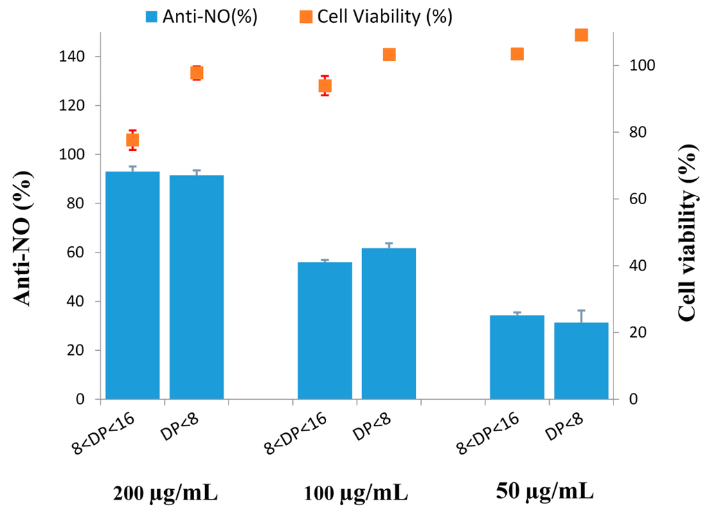 In this study, the anti-inflammatory activity of COSs (S1 and S2) was estimated in vitro model with LPS-stimulated RAW 264.7 cells. The inhibition of LPS-stimulated NO secretion was due to the anti-inflammation. First, to examine the potential cell cytotoxicity by S1 and S2, MTT assay was conducted. When RAW 264.7 macrophages were treated with S1 and S2 at a concentration of 0, 50, 100, and 200 µg/mL, along with 1 µg/mL LPS, the resulting viabilities of RAW 264.7 cells were summarized in Figure 6. The results of statistical analysis indicated that treatment with S1 (8 < DP < 16) (50, 100 µg/mL) and S2 (DP < 8) (50, 100, 200 µg/mL) had no noticeable toxic effect on cell growth when comparing to 0.05% DMSO group (100.00% ± 2.17%). Although the viability of cells exposed to 200 µg/mL S1 was 77.64% ± 2.90%, it was significantly different from 0.05% DMSO group (Figure 6). S1 at a high concentration had the effect of cytotoxicity. These results revealed that no observable cytotoxicity was observed at concentration levels between 50 and 100 µg/mL of S1 and concentration levels between 50 and 200 µg/mL of S2. S1 and S2 (0–200 µg/mL) inhibited LPS-induced NO production in a concentration-dependent fashion. Although both S1 and S2 (200 µg/mL) were capable of inhibiting NO production by 93.07% ± 2.02% and 91.51% ± 1.99%, respectively in LPS-stimulated cells, S1 showed significant cytotoxicity. The IC50 values of S1 and S2 representing anti-inflammatory effect were of 82.65 ± 1.18 and 76.27 ± 1.49 µg/mL, respectively (Figure 6). These results indicated that S1 and S2 exhibited different degrees of anti-inflammatory capabilities. Anti-NO (%) was higher for S2 than for S1 at a concentration of 100 mg/mL, whereas the opposite behavior was observed for the other concentrations of 200 and 50 mg/mL. Take the error margin into consideration; we assume that the S2 might have higher activity than that of S1. Similar results were reported, as the low DP COS possessed higher anti-inflammatory effects, while the one with high DP COS possessed lower effects [43]. The findings of anti-inflammatory capability along with antioxidant activity of S2 make it a promising candidate for further investigations and could be recognized as a promising anti-inflammation agent based on its inhibitory profile on NO production.