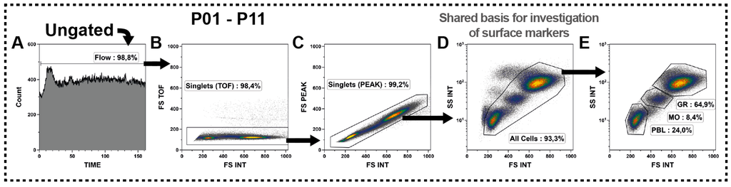 Definition of the All Cells-gate as crucial basis for the subset identifications by surface markers. (A) Acquisition characteristics were evaluated and irregularities were excluded by definition of Flow-gates for each panel; (B,C) Then, doublets were excluded by cross-checking the forward scatter (FSC) signal for its integral (INT) versus time of flight (TOF) and peak (PEAK) characteristics; (D) Finally, the All Cells-gate was defined based on its scatter characteristics. Hereby, the events that shifted to a lower FSC signal were considered as dead or dying cells and removed together with the debris from that definition; (E) The All Cells-gate could be subdivided on its scatter characteristics into granulocytes (GR), monocytes (MO) and lymphoid cells (PBL); and (A–E) Black arrows represent the gating strategy and the depicted percentages depend on the respective input gate.
