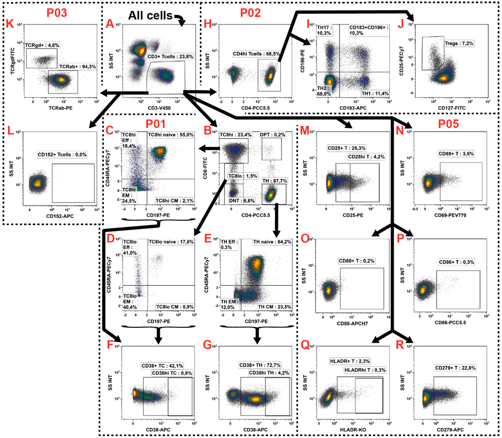 Gating strategy for the identification of fourteen T cell subsets and the determination of their activation state. (A) The T cells were identified by their CD3 expression defining the same gates for the panels P01, P02, P03 and P05; (B–G) The P01 was used for the identification of TC and TH subsets; (B) Thus, first the TH and TC were identified by their differential CD4 and CD8 expression, whereby the TC were differentiated into CD8hi and CD8lo populations. Additionally, the double negative (DNT) and double positive (DPT) T cells were recorded; (C–E) The TH, TC8hi and TC8lo were further distinguished into naïve, effector (Eff), effector memory (EM), and central memory (CM) subsets by their CD197 and CD45RA expression; (F,G) In order to determine the activation state of these subsets, the CD38 expression was examined; (H,I) In P02, the TH were differentiated into TH1, TH2, and TH17 by their CD186 and CD196 co-expressions; (J) In addition, the TREG were identified by their CD25hi/CD127-/lo phenotype; (K,L) The P03 was introduced for identification of the general TCR expression as well as the examination of the regulation of the immunosuppressive CTLA-4; (M–R) Finally, the P05 investigated the activation state of T cells in general, examining the expression of CD25, CD69, CD80, CD86, and HLA-DR, as well as that of the CD279; and (A–R) Black arrows represent the gating strategy and the depicted percentages depend on the respective input gate.