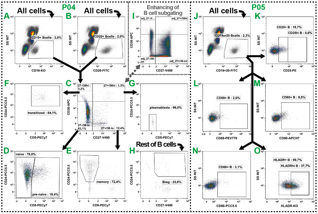 The activation state of B cell subsets was examined in P05. For this, both pan markers (CD19 and CD20) were combined into the same fluorescence channel (Figure 4J) resulting in the saving of one channel. Subsequently, the expression of CD25, CD69, CD80, CD86 and HLA-DR was examined on B cell level (Figure 4K–O), as described above for the T cells.
