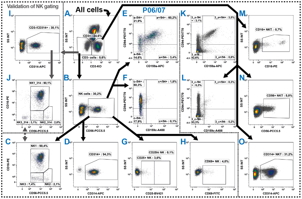 Gating strategy for the identification of three NK cell subsets (A–C) and their functional states (D–H), as well as several NKT cell subsets (K–O). (A–C) The NK cells were determined in P06 and P07 as CD3−/CD56+ cells and subsequently distinguished into three subsets by their CD56 and CD16 co-expression into NK1, NK2 and NK3; (D–F) Their cytotoxic activity was determined examining the expression of CD314, the suppressing CD159a and the activating CD159c, whereby the latter two were analyzed in co-expression to CD94; (G,H) In addition, their activation state was determined by examining the expression of CD25 and CD69; (I,J) As CD56 is generally low expressed, the NK cell identification was cross-checked by the CD314 expression on CD3− cells and also the three subsets were validated; (J,K) In parallel, NKT cells were determined as all CD3+ cells which simultaneously expressed one of the typical NK cell markers CD16, CD56, CD94, CD159a, CD159c or CD314; and (A–O) Black arrows represent the gating strategy and the depicted percentages depend on the respective input gate.