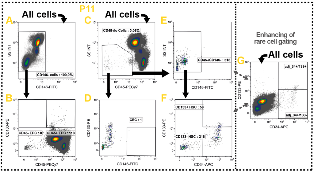 These rare and heterogeneous cell populations are characterized in P11 (Table 1: yellow row) evaluating the expression of CD34, CD146 and CD133 in addition to the common leukocyte marker CD45 [] (Figure 7). Here, one has to stress that no precise phenotypic definitions exist for identification of these rare cells. However, consensus was found in defining CECs as CD146+ and CD133− [,,,]. In contrast, the EPCs lack CD146, but express CD133 [,,,]. The HSCs are generally characterized as CD45−/lo and CD34+. Furthermore, they normally lack CD146 and potentially express the hematopoietic marker CD133 [,].
