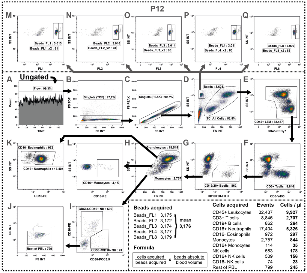 Determination of absolute cell counts by a simultaneous acquisition of cells and beads. (A–D) Similar to all other panels, first irregularities were excluded from analysis, followed by doublet discrimination and the definition of the All Cells-gate; (E–J) Then, various major cells were determined keeping a strict gating order always excluding the already identified cell types from the next gating step by the use of Boolean gates (termed as Rest); (E) First, leukocytes were discriminated from debris by their CD45 expression; (F) Then, the CD3+ T cells were identified; (G) followed by B cell identification by their expression of CD19 or CD20 within the CD3−cells; (H) Within the remaining cells the granulocytes and monocytes were detected by their particular scatter characteristics; (I) followed by detection of NK cells expressing CD56 and/or CD16; (Q) Then, all left-over cells were defined as Rest of cells containing non-determined cells such as DCs, basophils or HSCs; (K,L) Besides, the granulocytes and monocytes were further subdivided by their CD16 expression into eosinophils and neutrophils or CD16+ and CD16− monocytes respectively; (D) In parallel, the bead count was determined. Therefore, a Beads-gate was defined based on its dense scatter characteristics whereby it was important not to exclude the small beads together with debris; and (M–Q). Then, these beads were verified by their auto fluorescence properties. We found two populations in the FL1, FL2, FL3, FL4 (blue laser) and FL8 (red laser) representing a major singlet and a minor doublet population. Consequently, for each channel we added the doublet population twice to the singlet population and calculated the mean value out of all five channels (see table at the bottom). Then, using the indicated formula, the absolute cell count per µL of initial blood was calculated for all acquired cells as shown for the representative example.