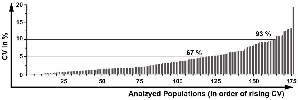 The evaluation of the remaining 176 populations showed that most populations (67%) had a very small CV below 5% (Figure 9), and nearly all populations (93%) had a small CV below 10%. Only 11 populations (6%) had a CV between 10 and 15% which were all rather small subsets (<0.1% of leukocytes) or low-frequently expressed activation markers. In the end, only one population (CD80+ monocytes) had with 19.8% a CV above 15% which is an activation marker almost not expressed on resting cells in blood samples of NHD.