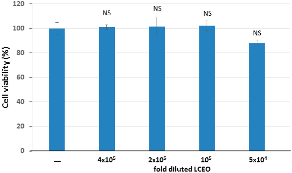 L. cubeba essential oils (LCEO) did not impair cell viability of dendritic cells (DCs). DCs were treated with LCEO at different concentrations (5 × 104-, 1 × 105-, 2 × 105- and 4 × 105-fold dilutions) at 37 °C in 5% CO2/air for 24 h. The cytotoxicity of LCEO was examined by Cell Counting Kit-8 (CCK-8) assay (Sigma-Aldrich, St. Louis, MO, USA). NS p > 0.05 (Mann–Whitney U-test) for the comparison between LCEO-treated and untreated DCs.