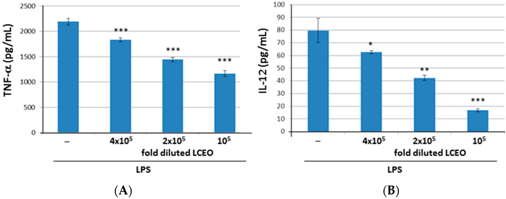 The release of TNF-α (A) and IL-12 (B) by lipopolysaccharide (LPS)-induced DCs were inhibited by LCEO. The DCs were treated with LPS or LPS + LCEO at different concentrations (1 × 105-, 2 × 105- and 4 × 105-fold dilutions). Supernatants were collected after 6 h to detect TNF-α and 24 h to detect IL-12. The amounts of TNF-α and IL-12 were determined by enzyme-linked immuno sorbent assay (ELISA). Each value represents the mean ± SD (standard deviation) of the data obtained from three wells for each treatment. * p < 0.05, ** p < 0.01 and *** p < 0.001 (Mann–Whitney U-test) for the comparison between the LCEO treated LPS-activated DC groups and the untreated LPS-activated DC group. All data are representative of three independent experiments.