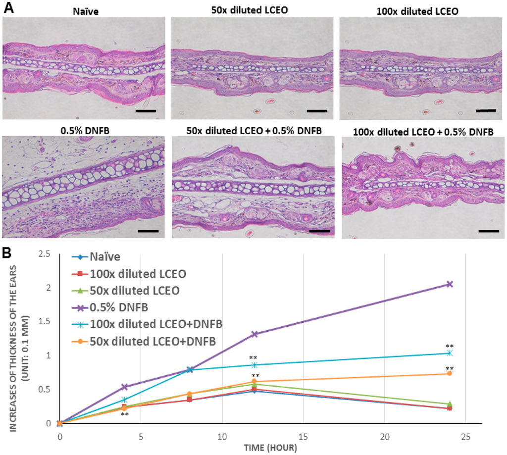 The contact hypersensitivity (CHS) response was attenuated in mice that had been treated with LCEO. 2,4-Dinitro-1-fluorobenzene (DNFB)-induced hypersensitivity response was carried out as described in the “Materials and Methods”. Mice were sensitized with vehicle (blue), 0.5% DNFB (purple), 100-fold diluted LCEO (red), 50-fold diluted LCEO (green), 0.5% DNFB + 100-fold diluted LCEO (light blue), or 0.5% DNFB + 50-fold diluted LCEO (orange) by painting their abdomens. The hypersensitivity response was examined by histological analysis using hematoxylin and eosin staining (A), and by measuring the thickness of the tested ear at 4, 8, 12, and 24 h (B). The scale bar represents 0.2 mm. Each value represents as mean ± SD from data of each group. ** p < 0.01 (Mann–Whitney U-test) for the comparison between the LCEO-treated DNFB-sensitized mouse group and the untreated DNFB-sensitized mouse group.