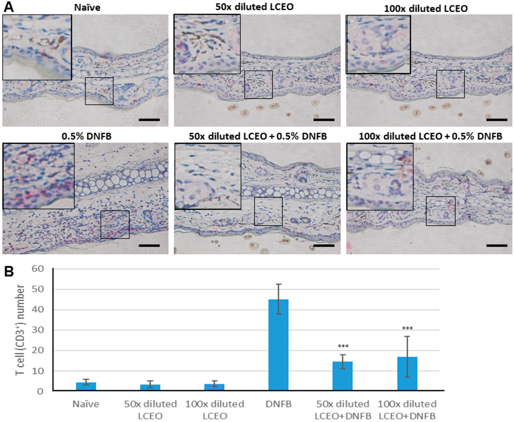 2,4-Dinitro-1-fluorobenzene (DNFB; Sigma-Aldrich, St. Louis, MO, USA)-stimulated hypersensitivity was conducted as previously described [8,24]. Briefly, 12 mice were used and grouped into four groups. To bring about sensitization, their abdomens were painted with vehicle, DNFB, 50-fold diluted LCEO, DNFB + 50-fold diluted LCEO, or DNFB + 100-fold diluted LCEO every day for 5 days. Then, both ears of all mice were painted with DNFB on the sixth day. The phenotype of the CHS were determined histologically in 24 h using hematoxylin and eosin staining. The thickness of the tested ear were measured. The increase of the thickness was calculated by the thickness of the challenged ear minus the thickness of the unchallenged ear. By immunostaining analysis using anti-CD3 antibody, the number of infiltrating T cells in the tested ear was detected and calculated as previously described [8].