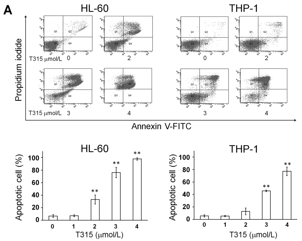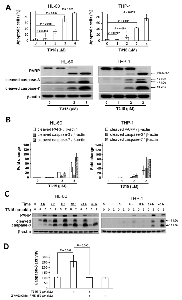 2.3. T315 Induces Apoptosis, Caspase Activation and Poly-ADP-Ribose Polymerase (PARP) Cleavage in AML Cell Lines
