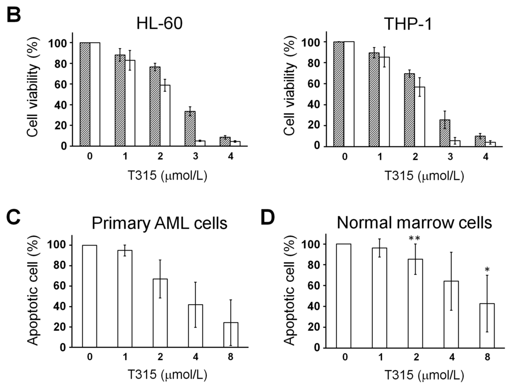 ) or 48 h (□). The cells were analyzed by MTS assay, as described in Materials and Methods; (C) Primary AML cells (0.25 × 106 cells/mL) were incubated with T315 or DMSO for 24 h. The cells were stained with annexin V-FITC and PI to assess apoptotic cells percentage (n = 26); (D) Normal bone marrow nucleated cells (0.25 × 106 cells/mL) were incubated with T315 or DMSO for 24 h. The cells were stained with annexin V-FITC and PI to assess apoptotic cells percentage (n = 16). * denotes p < 0.05; ** denotes p < 0.01 compared to the control group (in panel A) or compared to the primary AML cells at the same concentration of T315 (in panel D).