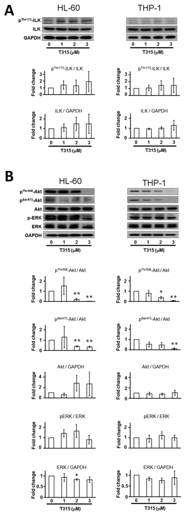 2.2. T315 Induces Down-Regulation of Protein Kinase B (Akt) and Phosphorylated Akt in AML Cell Lines