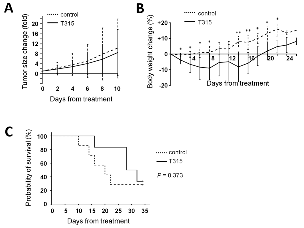 2.6. T315 Slows the Growth of THP-1 Xenografts and Prolongs the Survival of Tumor-Bearing Athymic Nude Mice