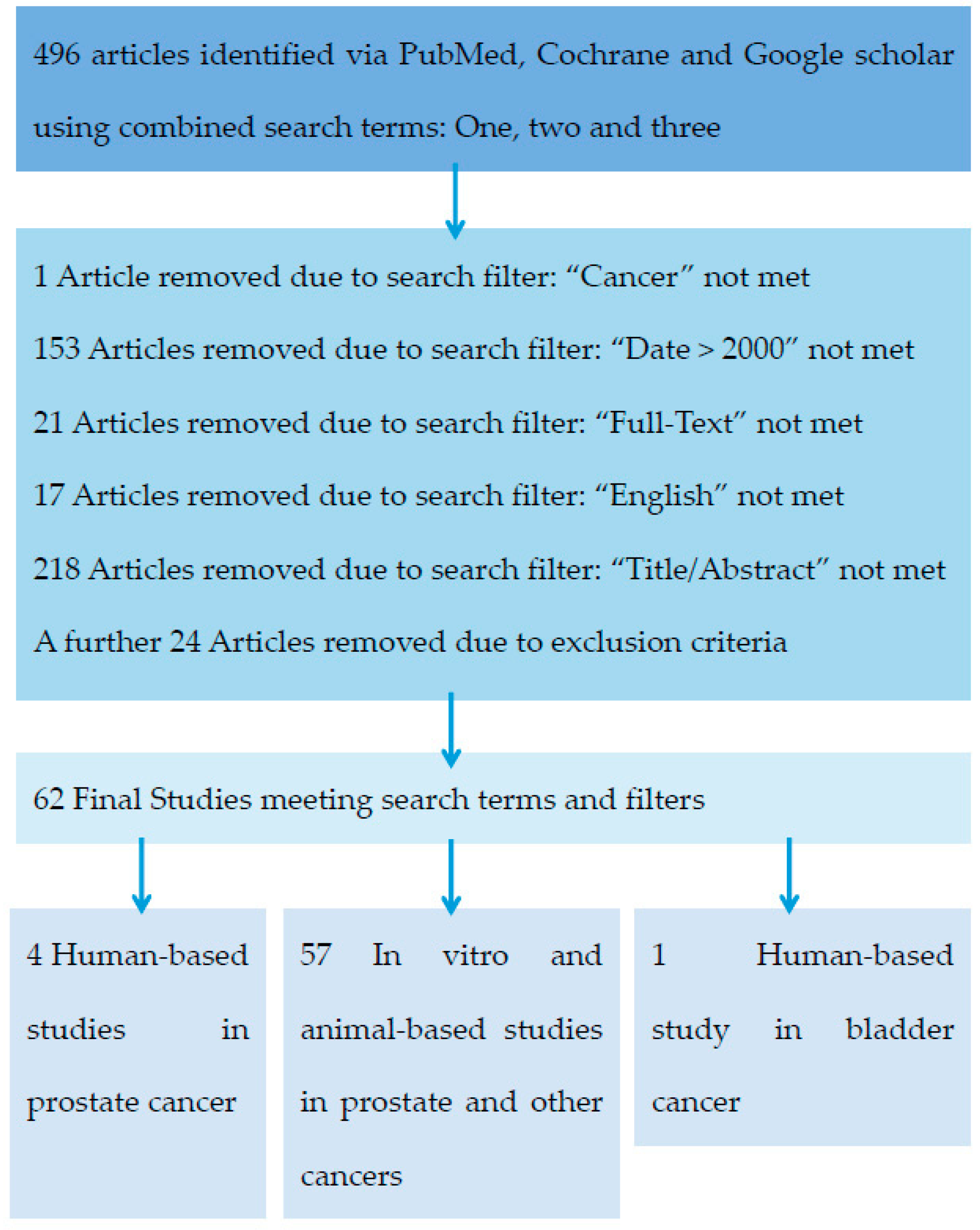 Pubmed, Google Scholar and Cochrane databases were accessed to retrieve articles. The search terms used to find the relevant articles were separated into three categories: terms that describe the α-antagonists, the target tissue and the action of the drugs (Table A1). Four hundred and ninety-six articles were identified using the inclusion criteria by searching three databases: Cochrane, Pubmed and Google Scholar. After exclusion criteria were applied, sixty-two relevant articles were obtained, consisting of fifty-four original manuscripts and eight review articles. (Figure A1). Of the fifty-four research articles identified only four studies examined the role of α-antagonists in PCa development in humans (Table 1). The majority focused on the cytotoxic and anti-tumour activity of α-antagonists in vitro and in animal models (Table 2). These retrospective cohort and observational human studies examined the effects of both quinazoline and non-quinazoline α-antagonists, but show only an overall decreased incidence of PCa. Two additional researchers replicated the search which returned identical results, validating the method used, for robustness.