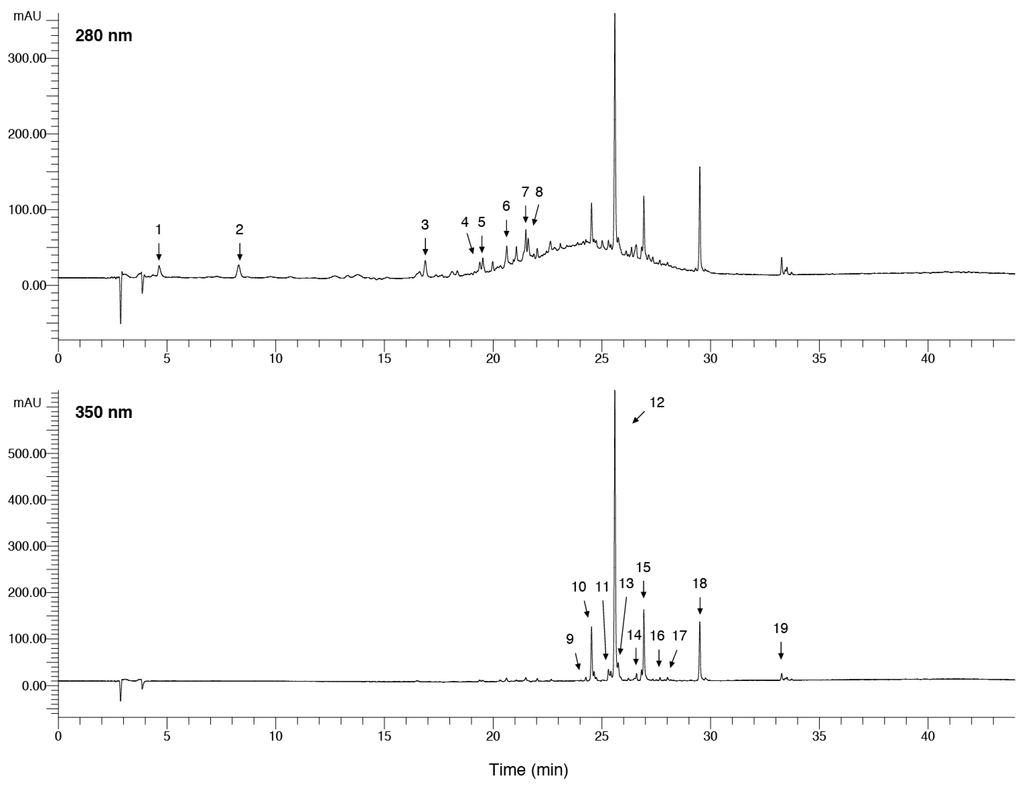 Chromatographic profile of crude ethanolic leaf extract (CEE) of leaves of Cistus incanus acquired by HPLC–DAD detected at the relative maxima of absorbance of proanthocyanins (280 nm) and flavonols (350 nm), respectively. Chromatographic conditions are given in the Materials and Methods section. For compound identification see Table 1.