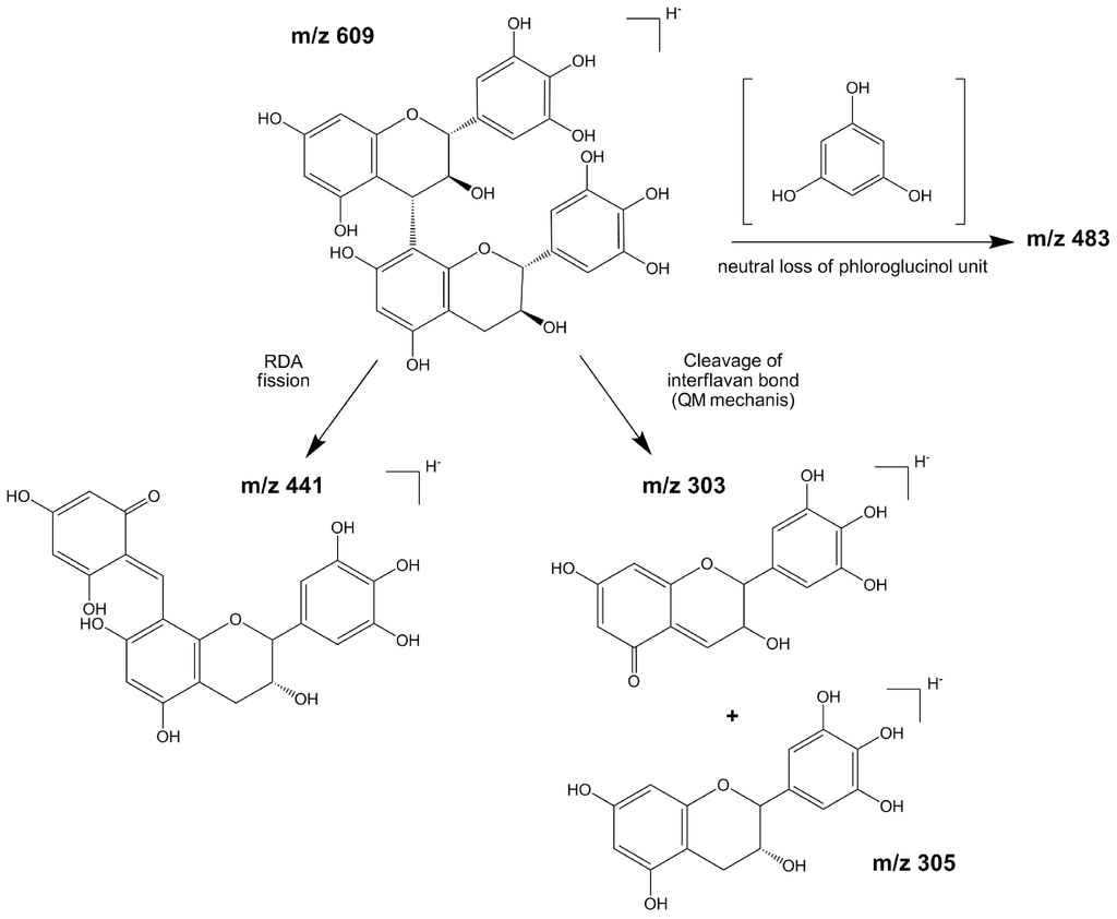 Hypothetical ESI(−)-MS/MS fragmentation pattern for Epigallocatechin dimer (peak 3, [M-H]− at m/z 609). RDA = Retro-Diels Alder fission, QM = Quinone Methide cleavage mechanism.