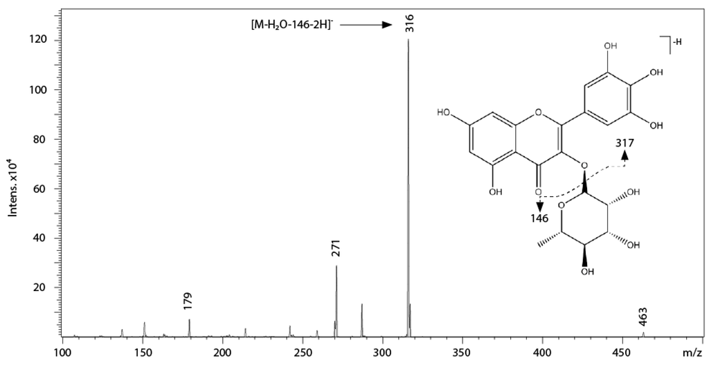 Ten compounds were identified as flavonols. As occurred in other members of Cistus subgenus [28], myricetin-3-O-hexoside (10) and myricitrin (12) were present in the CEE. Fragmentations of the precursor ions at m/z 479 (10) and at m/z 463 (12, Figure 3) had a common fragment at m/z 316 [M-H2O-Hexose-2H]−, which could be attributed to myricetin [30,31,32,33]. The neutral loss of sugar units (losses of 162 for the hexose and 146 for the rhamnose moieties from compounds 10 and 12, respectively) and the product ion at m/z 271, typical of 3-O-monoglycosides [34], confirmed the presence of these compounds.