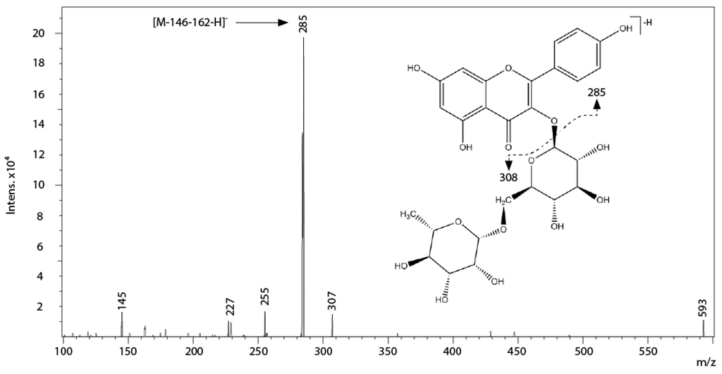 Peaks 13, 14 and 15 with precursor ions at m/z 609, 433 and 447 respectively, were identified as quercetin derivatives on the basis of the presence of their aglycone fragment (m/z 301). Particularly, peak 13 was positively identified as rutin, peak 14 as quercetin-3-O-pentoside, and peak 15 as quercitrin [22,24]. Peak 18 was identified as a kaempferol 3-O-rutinoside, on the basis of the pseudomolecular ion [M-H]− at m/z 593 and the fragment at m/z 285 ([M-146-162-H]−), due to the loss of a glucosyl and a rhamnosyl moiety in an unique fragment (Figure 4). This fragmentation pattern is characteristic of flavonol rutinosides, in which the linkage 1–6 between rhamnose and glucose, that forms rutinose, allows for free rotation and a more accessible fragmentation than other disaccharides [35,36]. In accordance with [19], peak 19 was assigned as kaempferol-3-(3″,6″-dicoumaroyl)-glucose with a molecular ion at m/z 739 and a fragment at m/z 285.