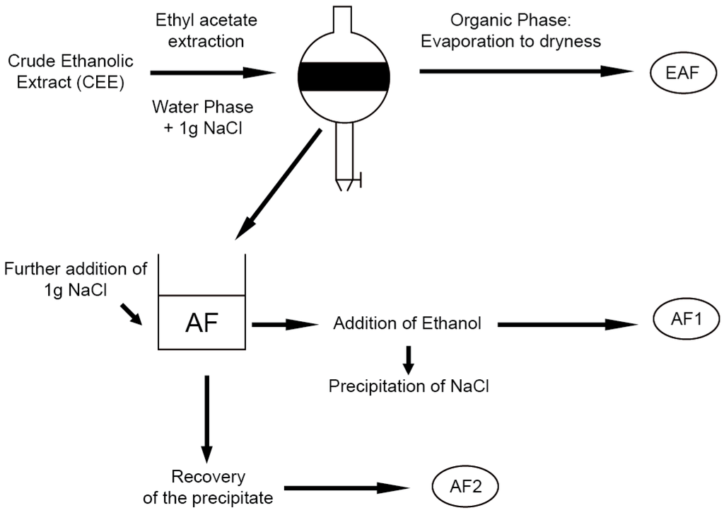 Scheme for fractionation of the CEE. EAF = Ethyl acetate Fraction, AF = Aqueous Fraction, AF1 = Aqueous Fraction 1, AF2 = Aqueous Fraction 2.