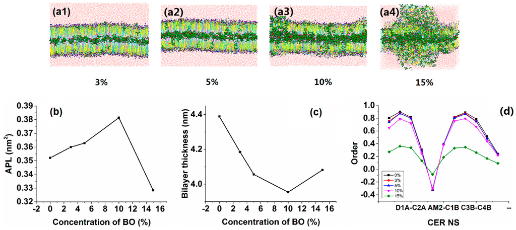 Figure 1(a1–a4) shows the CG simulation results of bilayer with different concentrations of borneol. We found that the lipid bilayer showed different morphological features at different concentrations of borneol, which indicated the different permeation enhancing mechanisms. Below the concentration of 10%, the lipid systems maintained a whole bilayer structure with most of the borneol molecules located at the hydrophobic lipid tail area (Figure 1(a1–a3)). The calculation of average area per lipid (APL), bilayer thickness and order parameters of CER NS (Figure 1b–d) showed that with the increasing of borneol concentration, there was a correlation between increased APL and decreased bilayer thickness and order. The borneol molecules permeated into lipid bilayer and occupied the intermolecular or intramolecular space of lipid molecules, which resulted in the increased APL. As such, borneol disturbed the orderly arrangement of lipid tails and made them easier to bend, which caused the bilayer thickness to decrease (Figures S1–S3 in Supplementary Materials). This much loosened structure increased the permeation of agents through the bilayer. By using fluorescence recovery after photo-bleaching technology (FRAP), Fu [] demonstrated that borneol improved the fluidity of lipid membranes and that the fluidity increased as the borneol concentration increased. Fu’s finding is consistent with our simulation results.