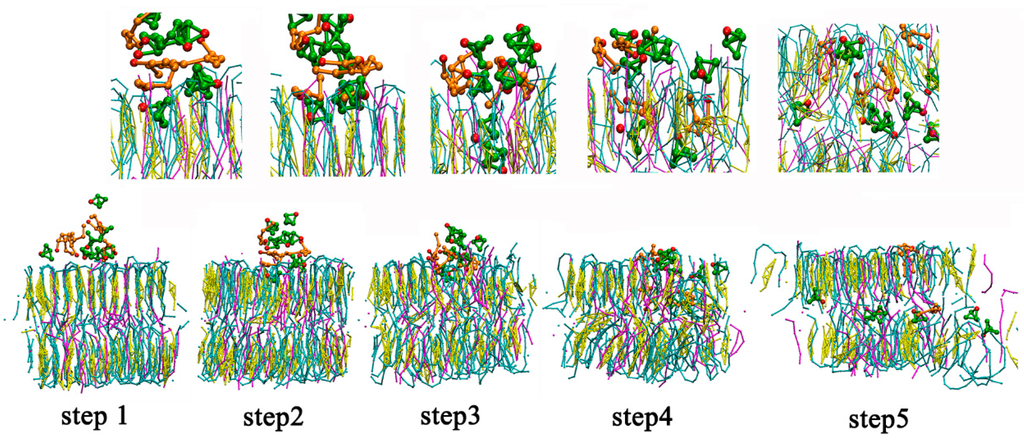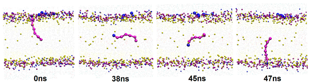 A typical lipid flip-flop process by CG-MD simulations. To show the dynamic process clearly, water and lipid tail beads were hidden in the figures.