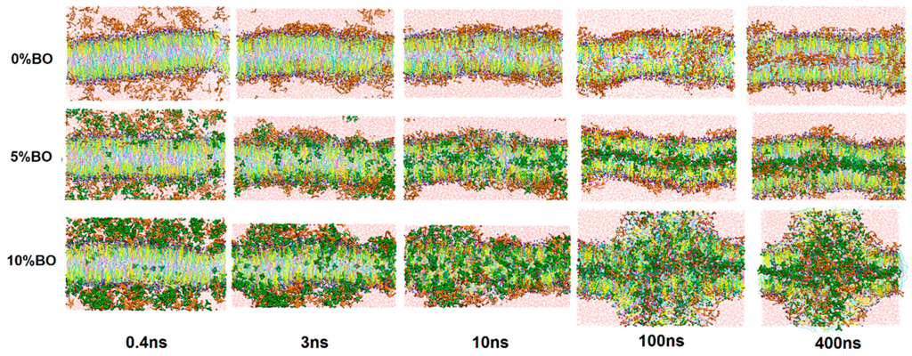 Figure 4 shows the morphology evolution of lipid bilayer systems with time. The osthole concentration was fixed at 10% to study the borneol concentration effect on the permeation behavior of osthole.