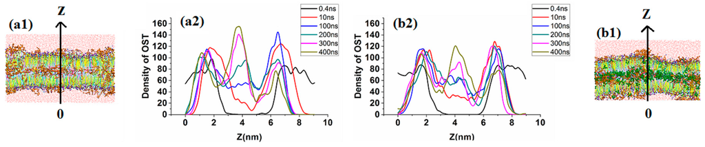 (1) Lateral views and (2) corresponding density profiles of osthole in z-axis direction in bilayer systems at different points in time by CG-MD simulations: (a) system without borneol; and (b) system with 5% borneol.