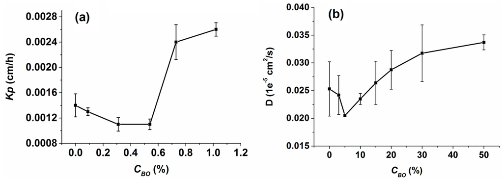 (a) Permeability coefficient Kp of osthole obtained from in vitro experiments; and (b) diffusion coefficient D of osthole obtained from CG-MD simulations. Either Kp or D reflects the diffusion rate of osthole in the corresponding lipid bilayer systems.