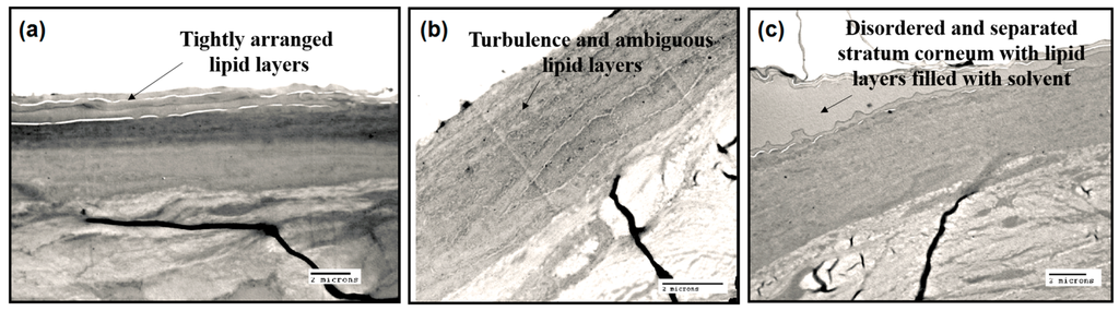TEM studies were performed to further assess the effects of borneol on the permeation of osthole. As shown in Figure 10a, in the absence of borneol, the SC exhibited the tightly arranged corneocytes with a surrounding packed lamellar lipid layers. After treatment with 0.54% borneol for 24 h, the SC became irregular. The turbulence and ambiguous lipid layers images are shown in Figure 10b. Focal dilutions occurred within the intercellular space, since the permeation of borneol into hydrophobic tail region disordered the arrangement of lipid molecules. However, when the concentrations increased to 1.02%, the lipid layers of stratum corneum were completely disordered and separated (Figure 10c). That may be the results of the water pores formed by borneol stimulated the permeation of solution containing osthole. In conclusion, the TEM studies verified our theory that intercellular lamellar bilayer turbulence and water pore formation induced by borneol enhanced the permeability of osthole.