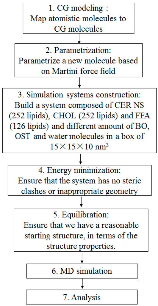 An initial mixed-bilayer membrane composed of CER NS (252 lipids), CHOL (252 lipids) and FFA (126 lipids) in a molar ratio of 2:2:1 was built in a box of 15 × 15 × 10 nm3. Coarse-grained water molecules (W) were filled into the box. The system energy was minimized using the method of steepest descent to remove the bad contacts between molecules. The minimized structure was equilibrated for 100 ns at 310 K. The structural properties of this mixed-bilayer system are shown in Section S3 of the Supplementary Materials. This equilibrated structure was further used as a starting structure to study the permeation behavior of OST at different concentrations of BO. The bilayer systems with different concentrations of BO and OST in water were also built using the Packmol package (Figure 12b).