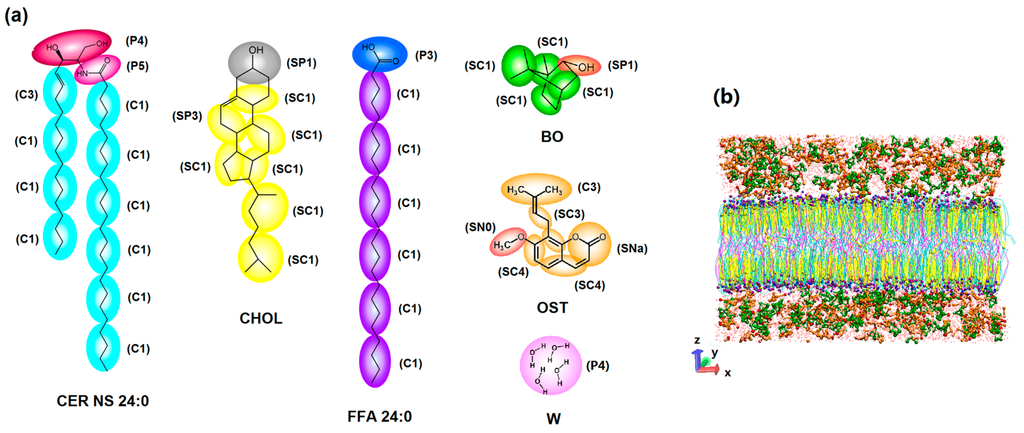 The CG models and their force field parameters used in this simulation were based on the Martini force field []. The Martini model is based on a four-to-one mapping (on average four heavy atoms are represented by a single interaction center), and a two/three-to-one mapping method is used for ring structures. Our simulation systems involved six molecules: CER NS (24:0), CHOL, FFA (24:0), BO, OST and solvent water (W). Their chemical structures and CG mappings are shown in Figure 12a and their interaction parameters are shown in Table S1 in the Supplementary Materials. Here, the CG models of borneol and osthole are new models developed by our team. The validation of these CG models is also shown in Section S2 in the Supplementary Materials.